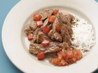Épépinez le poivron, coupez le en dés. Émincez le faux-filet. Faites chauffer un peu d'huile dans un wok ou une poêle et ajoutez le boeuf.
