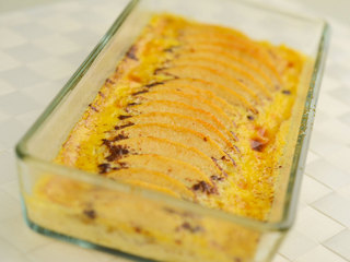 Rangez les pommes dans un plat à four, versez le mélange dessus, pour un résultat optimal couvrez tout juste les pommes de la préparation lactée.