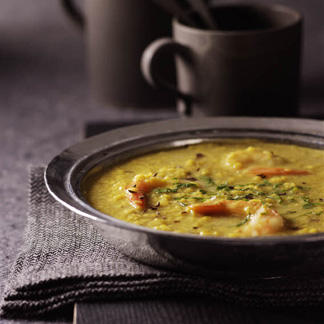 Décortiquer les crevettes. Juste avant la fin de la cuisson, ajouter le lait de coco et les crevettes pour les réchauffer. Rectifier l'assaisonnement en sel et poivre, et servir bien chaud, saupoudré de coriandre ciselée.