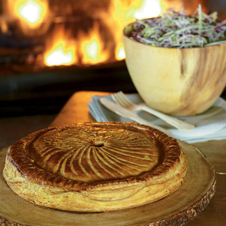 Préparer une dorure avec le jaune de l'½uf restant. Poser un disque de feuilletage sur une feuille de cuisson, et dorer la pâte au pinceau. Déposer la farce au centre, et recouvrir l'ensemble avec l'autre disque de feuilletage. Souder les deux feuilles de pâte en appuyant sur les bords. Percer un trou au sommet de la tourte, et couper l'excédent de pâte pour avoir une tourte bien ronde. Dorer l'ensemble, décorer avec la pointe d'un couteau, et laisser reposer 2 heures au froid avant d'enfourner.
