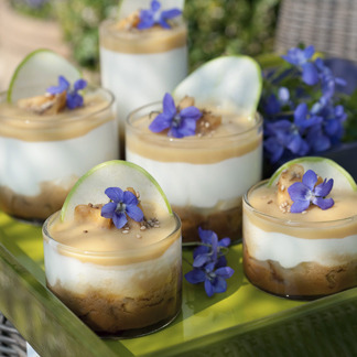 Servez frais décorés de fleur de violette et parsemés de graines de sésame.