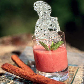 Finitions: verser le gaspacho dans quatre verres, arroser de jus de fraises. Déposer sur le côté de chaque verre deux mouillettes de pain d'épice. Décorer d'une sommité de menthe.